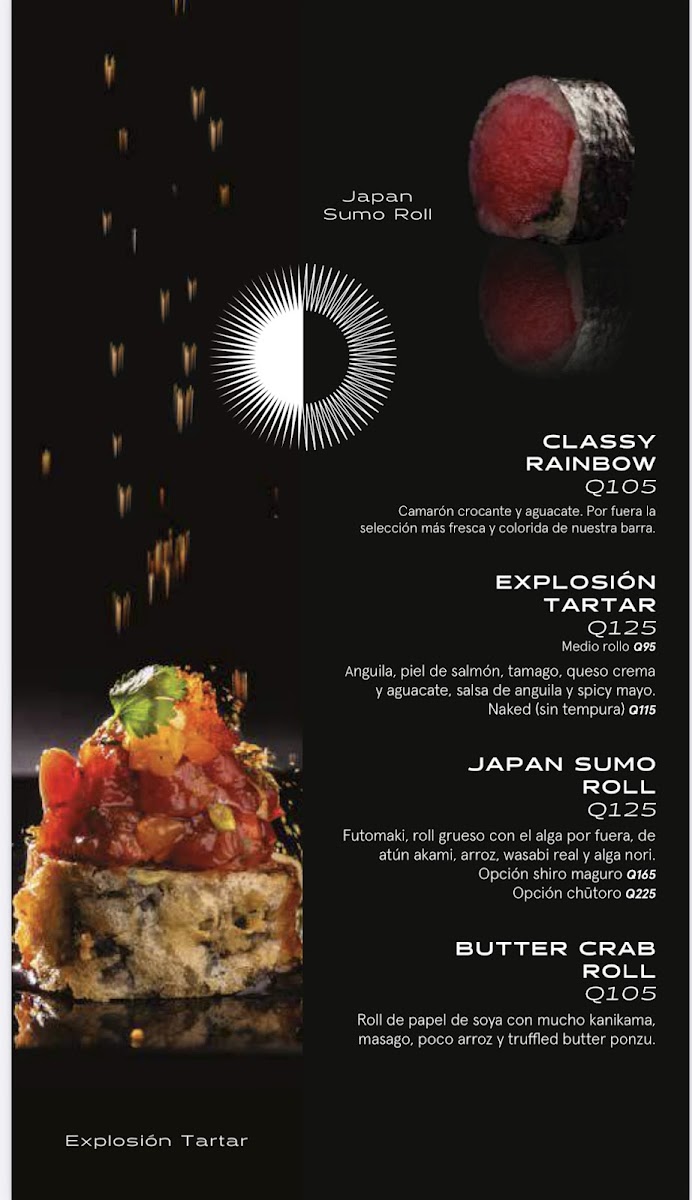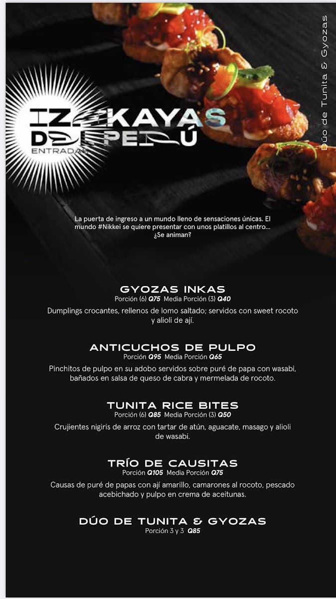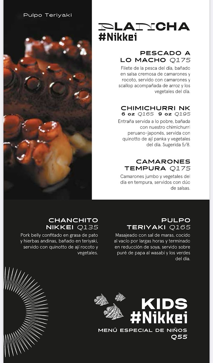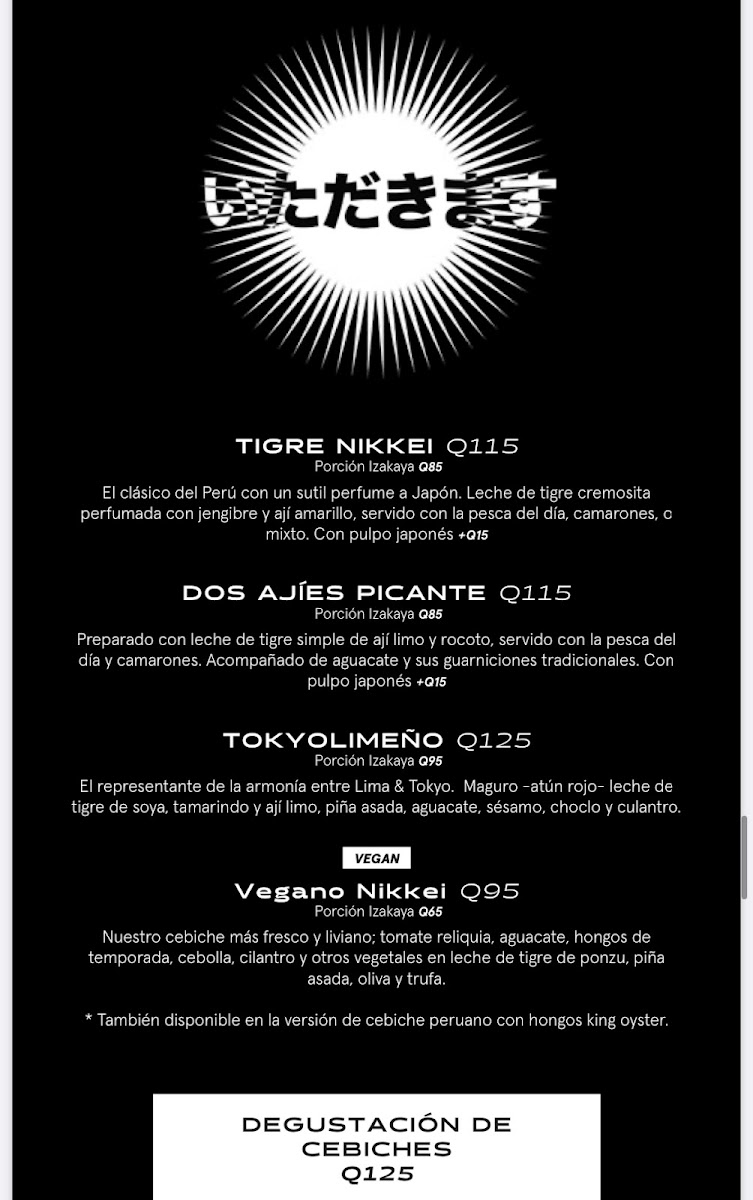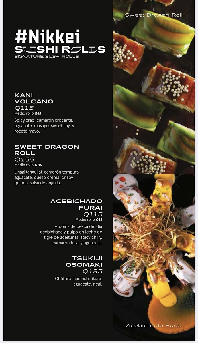 The menu at Nikkei Guatemala City, located in Oakland Mall, Cdad. de Guatemala, offers a delightful fusion of Japanese and Peruvian cuisine, combining fresh, high-quality ingredients with unique flavors. For those craving a refreshing starter, the Ceviche Fusión stands out as an ideal choice, delivering a balance of citrus and spice, while the Degustación de Cebiches offers a perfect sampler of different ceviches. The Ceviche Roll and Rainbow Roll are perfect for sushi lovers, blending the richness of fresh fish with delicate, vinegared rice. The Sushi Roll comes highly recommended, showcasing a variety of expertly crafted rolls that highlight the restaurant's commitment to quality.