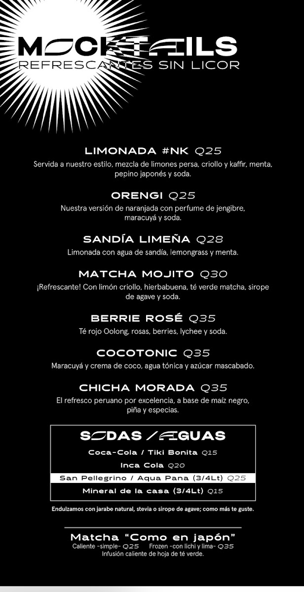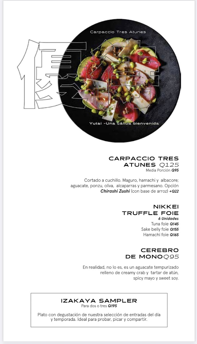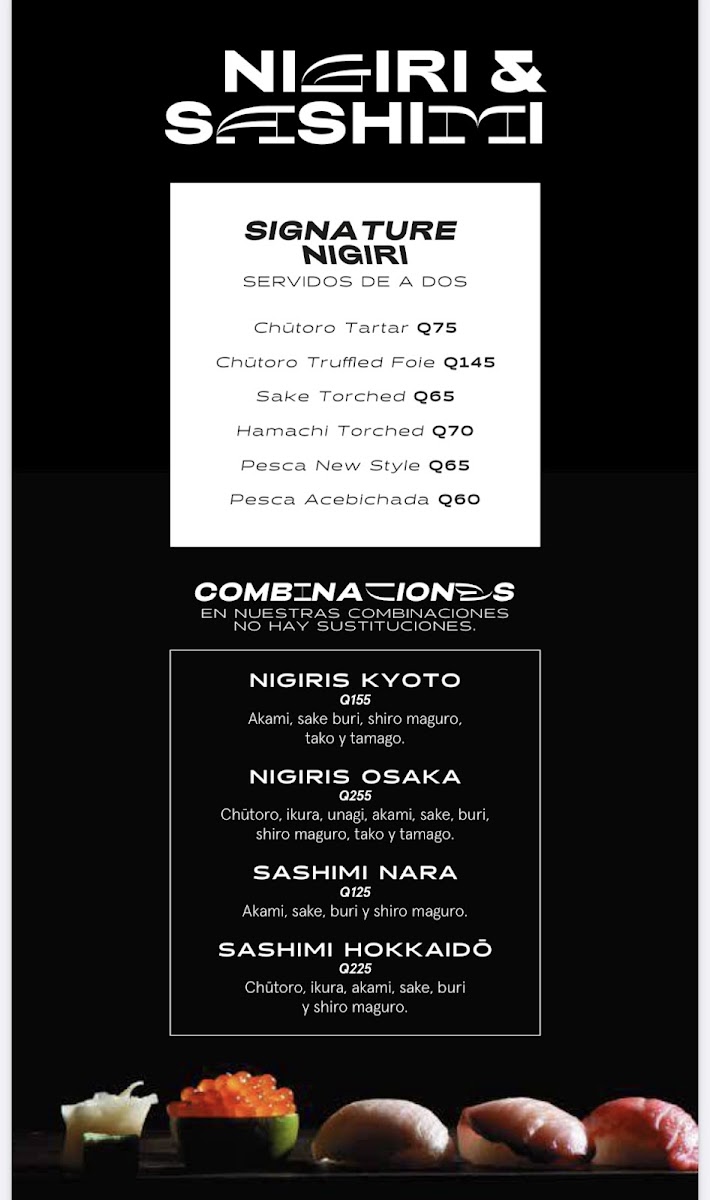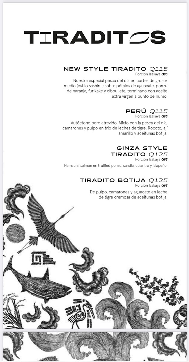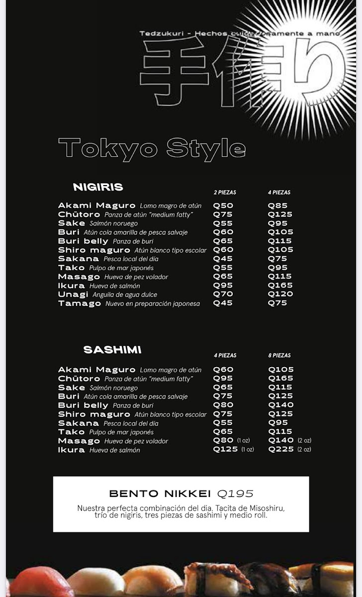 The menu at Nikkei Guatemala City, located in Oakland Mall, Cdad. de Guatemala, offers a delightful fusion of Japanese and Peruvian cuisine, combining fresh, high-quality ingredients with unique flavors. For those craving a refreshing starter, the Ceviche Fusión stands out as an ideal choice, delivering a balance of citrus and spice, while the Degustación de Cebiches offers a perfect sampler of different ceviches. The Ceviche Roll and Rainbow Roll are perfect for sushi lovers, blending the richness of fresh fish with delicate, vinegared rice. The Sushi Roll comes highly recommended, showcasing a variety of expertly crafted rolls that highlight the restaurant's commitment to quality.